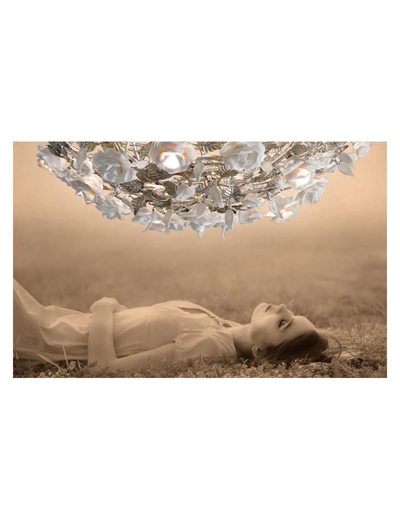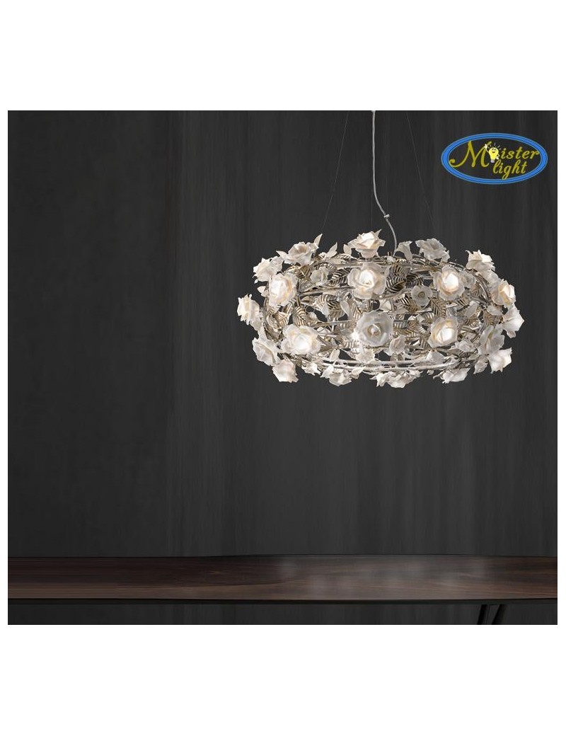 Rosa sospensione argento con rose in porcellana design decorativo 70cm