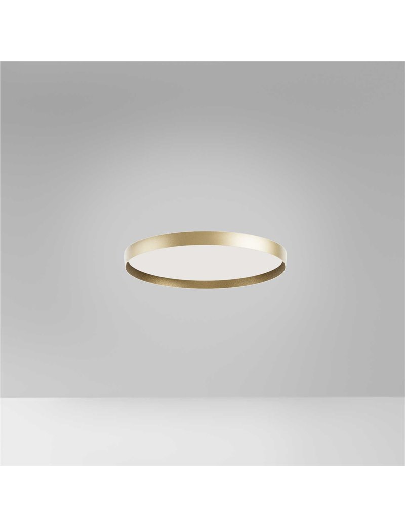Montatura in alluminio oro spazzolato. Diffusore in metacrilato bianco opale. Sorgente luminosa led dimmerabile a taglio di fase tramite dimmer esterno+push (non inclusi).,Gea Luce